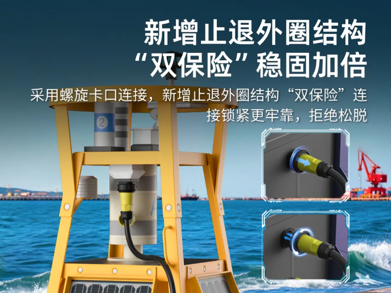 海洋環(huán)境振動(dòng)源復(fù)雜(如持續(xù)浪擊、強(qiáng)風(fēng)沖擊等),遠(yuǎn)超陸地場景,因而海洋環(huán)境監(jiān)測設(shè)備選用連接器非??粗剡B接鎖定的穩(wěn)固性。