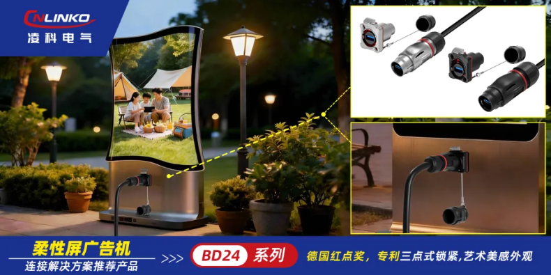 凌科BD24系列USB3.0工業(yè)連接器,符合工業(yè)級標準要求,專為應(yīng)對戶外復雜環(huán)境而設(shè)計。其卓越性能與可靠性,與柔性屏廣告機在戶外等嚴苛場景下的應(yīng)用需求高度契合,確保了數(shù)據(jù)傳輸?shù)母咚俜€(wěn)定與設(shè)備連接的持久耐用。
