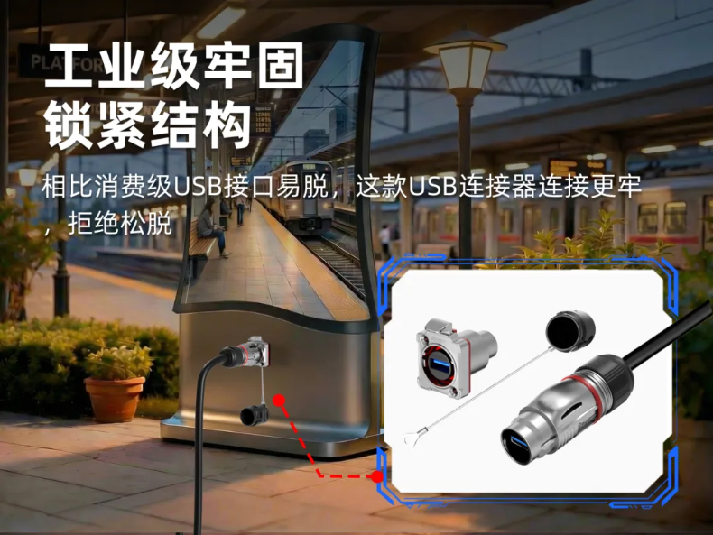 普通消費級USB插頭很容易在外力下松脫或斷連,因而連接更為牢靠的工業(yè)級USB連接器非常必要。