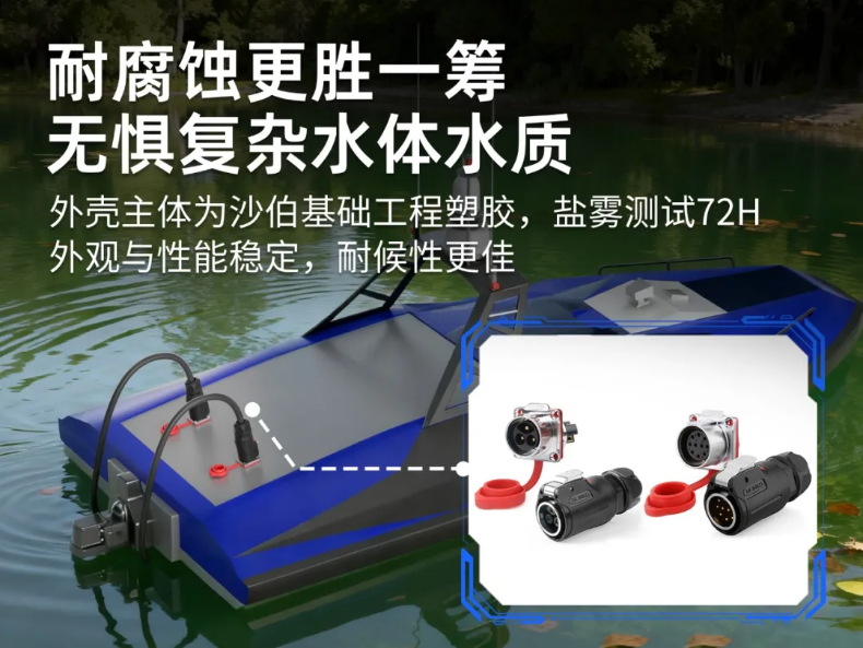 無論是安裝和無人船檢修,具備快速、省力、防誤插設(shè)計的工業(yè)防水連接器能大幅提升作業(yè)效率和可靠性。