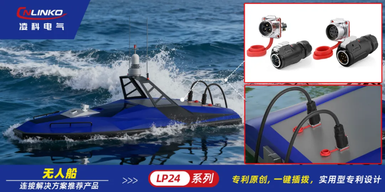 在為上述用戶的無人船提供的電源與信號傳輸方案中,由凌科的LP16系列3芯與10芯工業(yè)防水連接器提供支持。