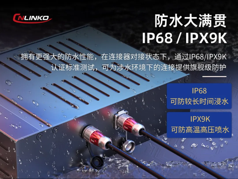 凌科DH16工業(yè)級(jí)連接器,通過(guò)IP68/IP69K認(rèn)證標(biāo)準(zhǔn)測(cè)試,可在暴雨、沖擊水流或沙塵環(huán)境中保障內(nèi)部器件的密封性;多重復(fù)合密封設(shè)計(jì)(內(nèi)部多道硅膠圈和結(jié)構(gòu)耦合),阻止水汽和顆粒物侵入。