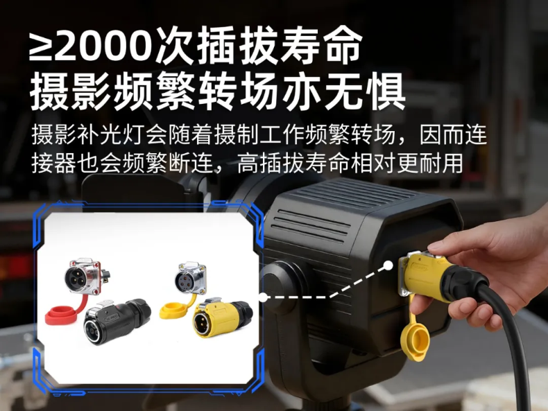 由于拍攝或直播等活動(dòng)需經(jīng)常轉(zhuǎn)場(chǎng),因而補(bǔ)光燈用連接器每天可能被多次插拔與組裝。