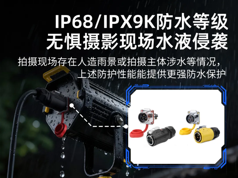 為了確保在復(fù)雜場(chǎng)景下的拍攝與直播能夠從容不迫,不掉鏈子,很多補(bǔ)光燈等器材紛紛選擇能直面惡劣環(huán)境,保障連接安全可靠的工業(yè)級(jí)連接器。
