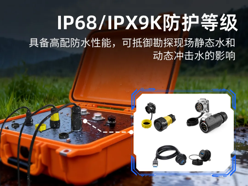 凌科YM24系列RJ45工業(yè)防水連接器、LP28系列8芯工業(yè)連接器、YU系列USB防水連接器,其防水等級均為旗艦級的IP68/IPX9K。能抵御脈沖震源勘探設(shè)備在野外面臨的各種水液侵襲。