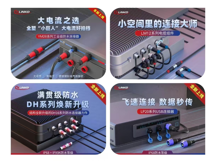本次展會新品多達(dá)十?dāng)?shù)款之多,展示了凌科2024年的研發(fā)成果。如最高50A電流的YM28系列大電流連接器;小空間連接和緊湊設(shè)備的最愛“LM12電纜組件”;IP68/IPX9K旗艦級防水的DH16系列連接器;搭載USB3.0高階版本接口的緊湊型高速數(shù)據(jù)連接器LP20-USB系列等,可謂各種連接方案的大聚合。