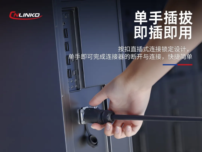 采用按扣直插式連接結(jié)構(gòu)設(shè)計,可單手快速插拔,適用于高頻插拔應(yīng)用場景,更快更高效更簡單。