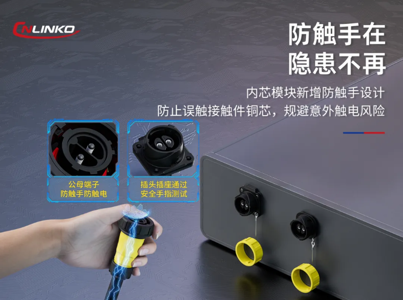 大電流、高壓連接器通常會傳輸幾十安至上百安的大電流,承載幾百至上千的高壓,因而其安全性至關(guān)重要。無論是公母端意外脫開還是操作者作業(yè)中誤觸,都可能釀成安全事故。目前常規(guī)的大電流連接器IEC60309插頭,一般防觸手設(shè)計(jì)不足,插針與插孔沒有做防觸手結(jié)構(gòu)或者不夠全面。